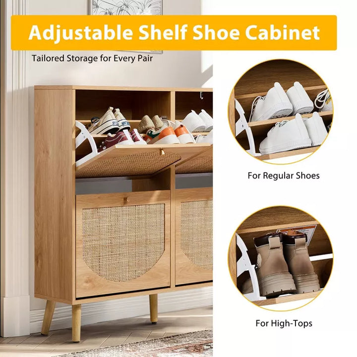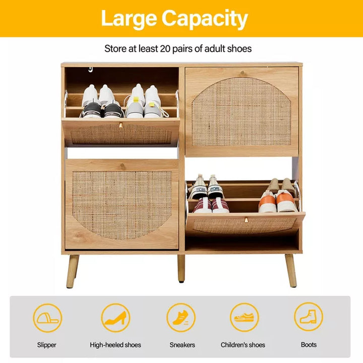 The elegant shoe cabinet with warm rattan which creates a modern and stylish style. Natural rattan skin increases the charm. The golden round handle brings a comfortable grip experience. It features a space-saving design, providing versatile storage and allowing it easier to place in entryways, hallways, living rooms, or bedrooms. It will perfectly keep your room away from the mess. Our double-layer shoe storage cabinet can accommodate a family's shoes. The shoe cabinet can be placed independently with five feet.