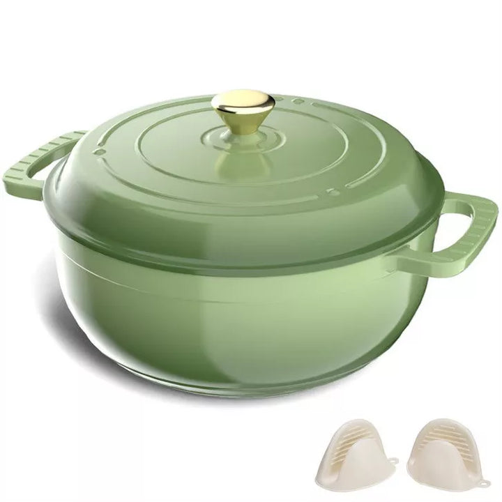Discover the perfect blend of functionality and durability with our Enamel Dutch Oven. Crafted with a thick, sturdy enamel-coated cast iron body, it ensures even heat distribution for consistent cooking results. The tightly-fitting cast iron lid, designed with 24 condensation bumps, traps steam efficiently, locking in flavors and nutrients while preventing drips. To enhance your cooking experience, the set comes with two thickened silicone oven mitts, providing a secure grip and protecting your hands from heat. Ideal for slow-cooking, baking, and braising, this Dutch oven is a must-have addition to any kitchen.