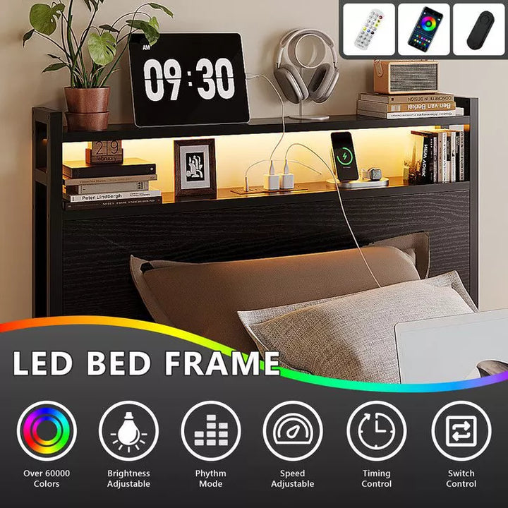 This bed combines storage, charging, and lighting for the ultimate bedroom upgrade. The headboard features a 2-tier shelf for phones and glasses, plus a built-in 5-in-1 power strip (2 AC outlets, 2 USB Ports, 1 Type-C Port) for convenient charging. Underneath, four spacious drawers offer ample storage.An integrated RGB LED strip allows you to customize your ambiance with colors and adjustable brightness via remote control. Built for durability and quiet comfort, the all-metal frame with reinforced slats and legs supports up to 660-880 lbs. Built with a strong frame and available in three colors, it’s a functional and stylish star of any adults Bedroom Furniture Sale.