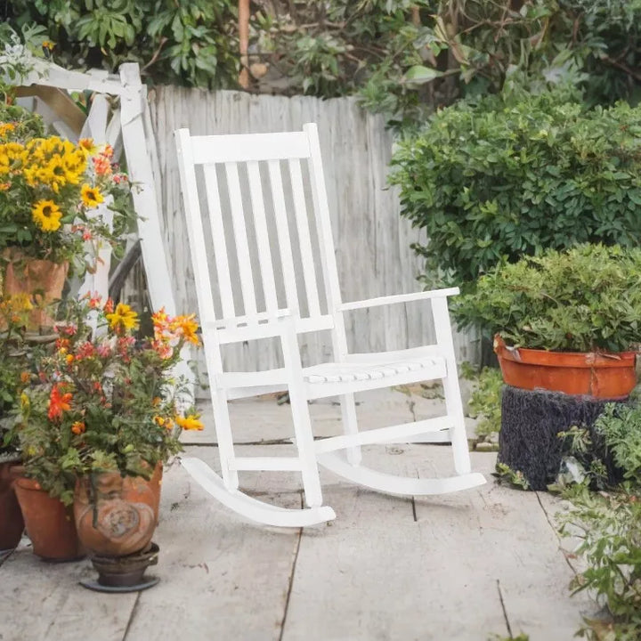 Embrace coastal vibes with this beautifully designed rocking chair, perfect for your backyard or front porch area. Its solid poplar wood frame and legs ensure a stable structure, letting you relax and enjoy a soothing cup of morning coffee. The simple and classic design provides a comfortable rocking motion, allowing you to soak up the fresh breeze of a sunny spring day or a summer night. Engage in delightful conversations with friends while experiencing the gentle sway of this outdoor rocking chair. Just remember, it has a weight capacity of 250 lbs., and cushions are not included.