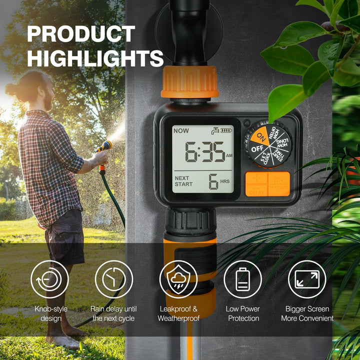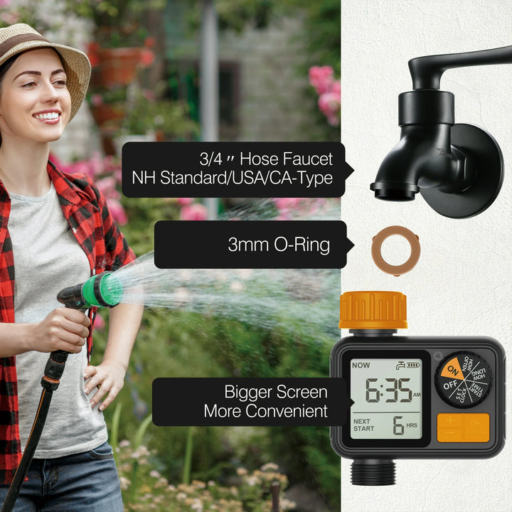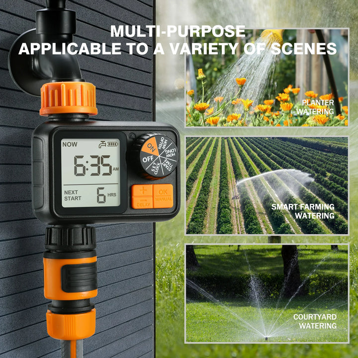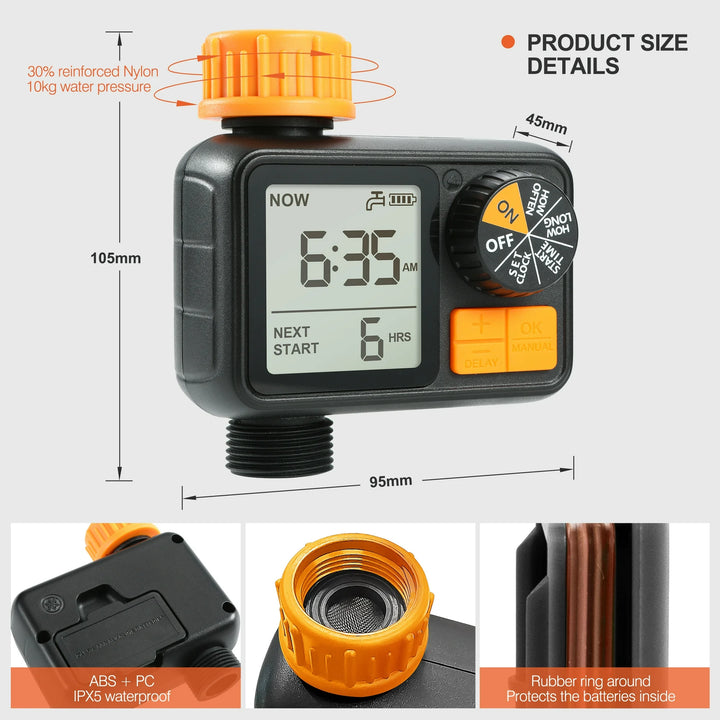 - 【Durable and Waterproof】Designed with heavy-duty construction, our garden timer is made of IPX5 waterproof, anti-UV coating, and anti-rust materials, with a seal ring on the battery cover to isolate moisture and extend lifespan. Perfect for outdoor use like garden irrigation watering, lawn sprinkler controller, and more.