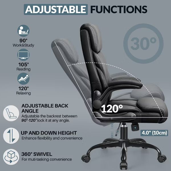 Ergonomic Office Chair: Our executive chair provides thick headrest supports your head, while the backrest molds to your body's curves to reduce discomfort. The wide seat cushion with high-density foam ensures lasting support for long hours. Versatile Computer Chair: This office chair high back features adjustable seat height and a rocking backrest that moves from 90 to 120 degrees for optimal comfort. Enjoy smooth transitions between work and relaxation with its flexible design. Heavy Duty Executive Desk Chair: This big and tall office chair features a sturdy metal base designed for tall individuals, supporting up to 400 pounds. Its smooth-rolling wheels rotate 360 degrees, allowing effortless movement without damaging your floors. Elegant Modern Design: This leather office chair features unique stitching and filling for a striking appearance. Made with high-quality PU leather, it offers a skin-friendly texture, durability, and easy cleaning, blending style with practicality. After Service: Customer satisfaction is our priority for our home office desk chair. The 400-pound capacity chair assembles in 15 to 30 minutes. For inquiries about the plus-size desk chair, please reach out—we're committed to excellent support