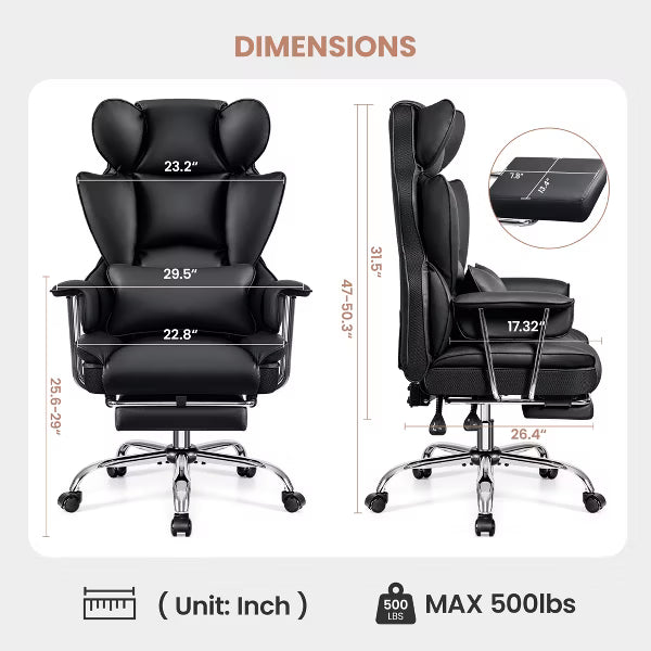 Advanced sofa-like sitting feeling: BESTFAIR executive office chair adopts ergonomic design, the back of the chair perfectly fits the curve of the spine, the interior is filled with soft rebound sponge, and the external cushion is free to use to adapt to different needs, providing you with a close and comfortable sitting feeling. The product is equipped with a retractable footrest, effectively reducing leg fatigue, so you can be comfortable all day long; High-end atmosphere shows luxury: BESTFAIR office chair is wrapped in high-quality PU leather, delicate and soft touch, with high-density rebound sponge, comfortable and full support. The overall design is simple and atmospheric, the lines are smooth and elegant, the details show craftsmanship, double stitching process is exquisite and delicate, the luster convergence, showing high-end taste. Whether it's classic black or elegant brown and gray, it can be easily integrated into modern office environments and become the finishing touch in the space. Multi-functional adjustable office chair: BESTFAIR executive executive executive chair is equipped with backrest adjustment function, which can easily lie in any angle, cushion height adjustment function to adapt to different office/resting heights, 360¡ã swivel function with mute casters to make the sliding smooth and noiseless, protecting the floor while adding a serene and elegant office environment. All-around comfort on demand: BESTFAIR office chair combines comfort and practicality, providing you with all-around comfort and support. Whether you are focusing on office work, a short break, or a relaxing meeting, you can easily cope with it, perfectly adapted to a variety of scenarios, to create an efficient and comfortable office experience for you! SOLID GUARD: This tall home office leather chair features a sturdy and durable structural frame that has been precision load tested to carry up to 500 pounds. No matter what size you are, it will provide you with solid and reliable support, ensuring that you will remain comfortable and worry-free even after long hours of use. EASY INSTALLATION AND WORRY-FREE SERVICE: Our home office chairs come with detailed installation instructions and installation videos on the product page for your reference, you can easily assemble the office chair by yourself.BESTFAIR has a professional customer service team to provide you with worry-free after-sales service. If you encounter any questions or problems, please feel free to contact us by email, we will provide you with satisfactory service!
