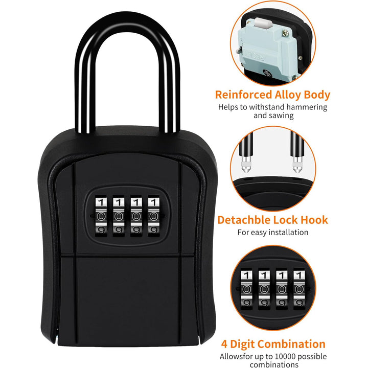 - Large Capacity Lockbox: Upgraded resettable 4-digit code lock box has a large internal storage space:3.7*3.1*1.4inch, can store 5 house keys. You can put your house keys or small car keys in it for emergency entry when you go out for business or on vacation. Safe and convenient.
