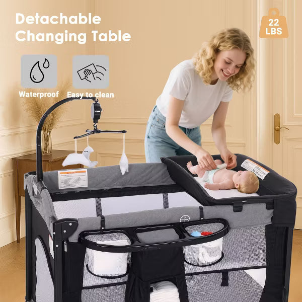 4 In 1 Playard & Bedside: The luxurious nursery center will witness your child's growth; Parents can easily change diapers; As a bedside crib, the full size bassinet and toddler play yard; Adjustable height can be suitable for various parents bed