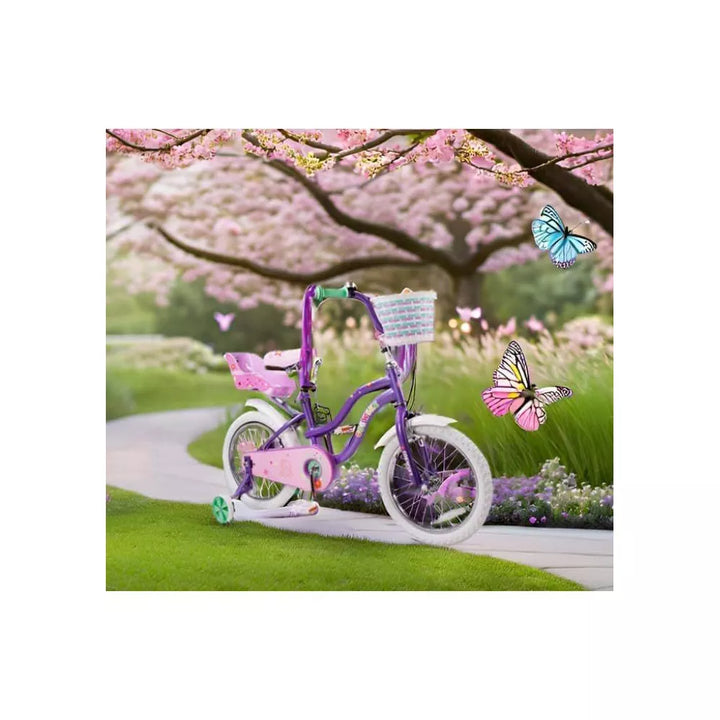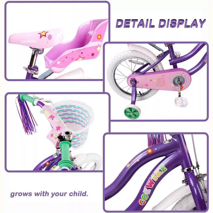 The Kinder King Bike is designed with a durable steel frame and available in 12-16 inch sizes to grow with your child. Adjustable handlebars and a tool-free seat adjustment ensure a perfect fit. Designed for girls, it features a rear doll seat with secure straps and colorful streamers for a fun, magical ride. Safety comes first with a front and rear hand V-brake, coaster brake, wide air-filled tires, and a fully enclosed chain guard. Ideal for beginners, it includes training wheels and a wide footrest for stability. With 95% pre-assembly and included tools, setup is quick and easy. Let your child ride in style and confidence with Kinder King!