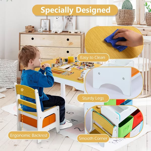 Ample Storage Space: The art table provides abundant storage space: 6 side drawers, 2 fabric bins under chairs and 3 compartments. This design enables kids to develop the habit of organization and keeps their toys, books, stationery, art supplies, etc very nearby.