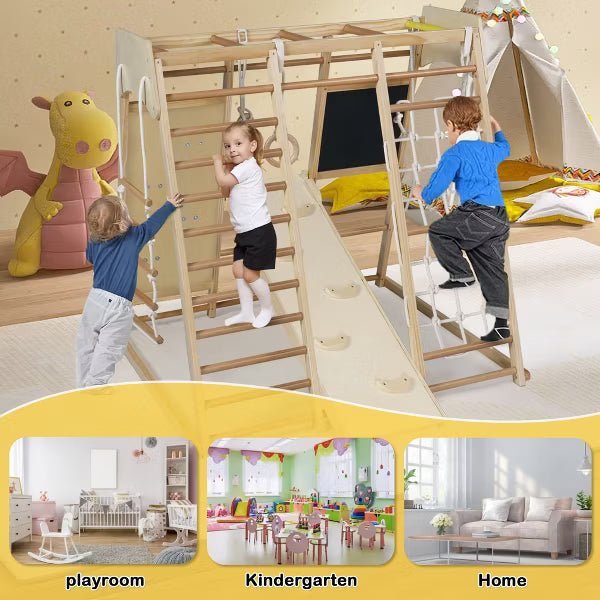 Kinder King toddler climbing set is an ultimate indoor toy playset designed to provide endless excitement and adventure for your little ones. Made with safe and premium wood, this 10-in-1 wooden indoor jungle gym is sturdy and durable. The unisex playground set features a rope ladder, climbing ramp, slide and swing, climbing net, monkey bar and even an drawing board. It helps promote balance, coordination and motor skills all while having fun. Keeping toddlers and young children engaged and active!