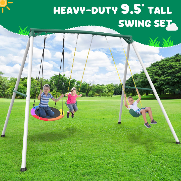 Create the ultimate backyard playground for family fun with the KloKick 9.5-Foot Heavy Duty Swing Set. Designed for both kids and adults, this versatile swing set supports up to 600 pounds, allowing multiple users to enjoy swinging together. Whether you're relaxing on the spacious 32" round saucer swing or enjoying the classic belt swings, this set is perfect for kids of all ages and offers plenty of room for fun. The durable steel frame is powder-coated to prevent rust, and the A-frame design ensures stability and long-lasting strength.