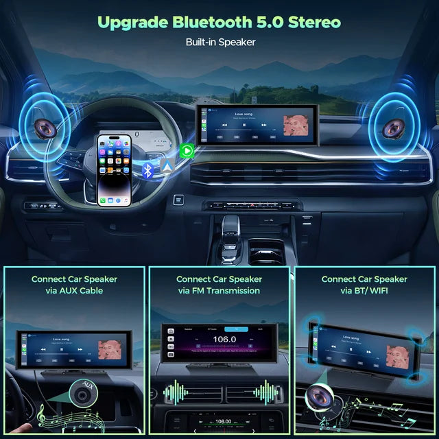 🔗【Stable Bluetooth 5.0 & FM Transmission & AUX Cable】The LAMTTO portable car audio receiver features Bluetooth 5.0 for a more stable connection, avoids interruptions, and listens to the radio, weather forecasts and news updates in real-time. This portable carplay screen has built-in speakers, but for louder sound, you can stream the audio to your car speakers via FM frequency sync or by connecting the included AUX cable to your car's AUX input jack.