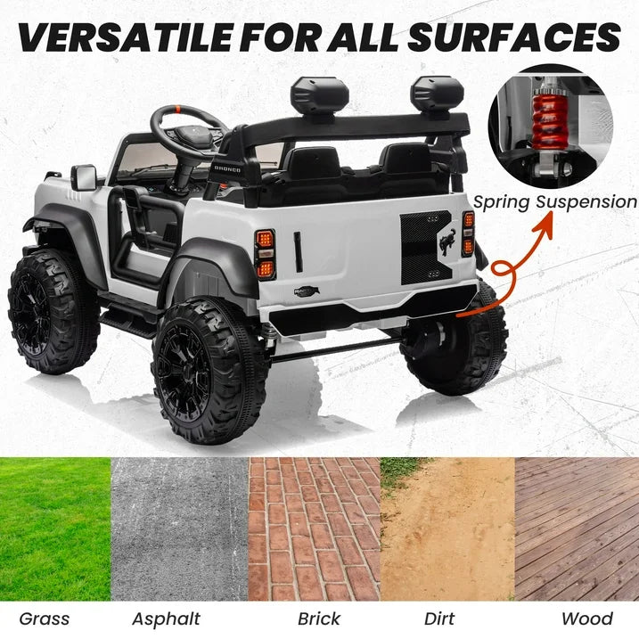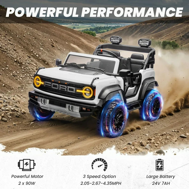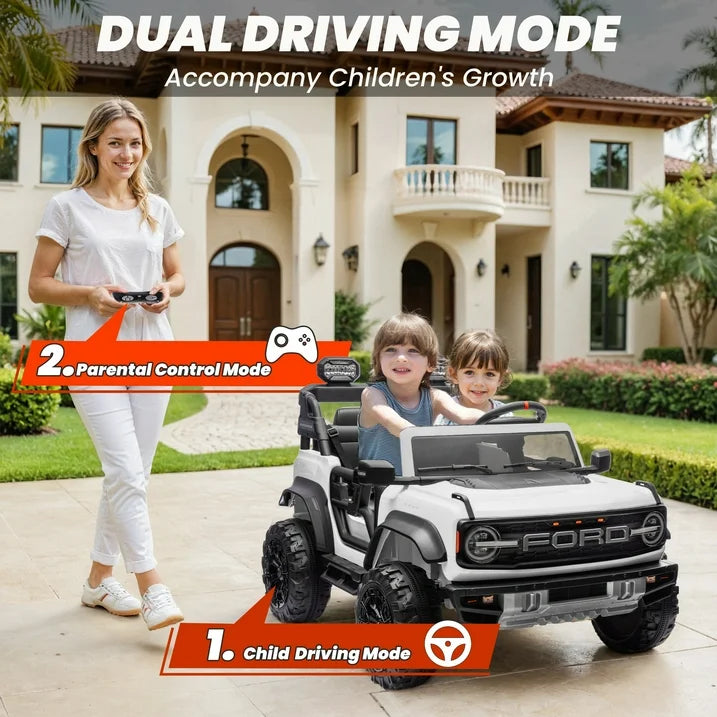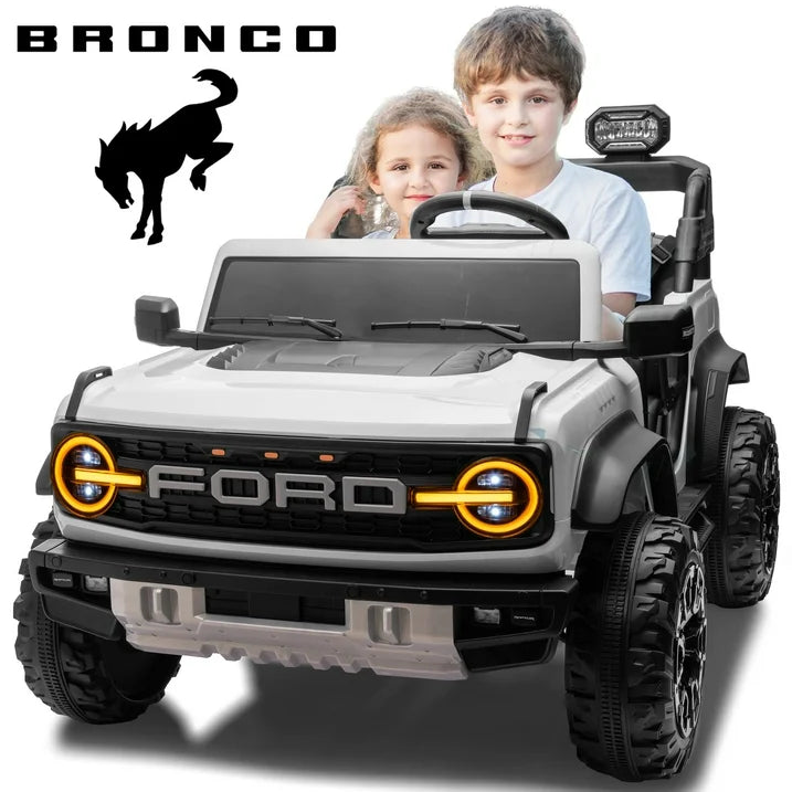 - The Licensed Ford Bronco Raptor 24V Kids Electric Car combines thrilling yet safe adventures with parent-controlled remote, ASTM F963 certification, dual 90W motors for slopes/grass, Bluetooth music, 2-seater durability (130lb capacity), and 24/7 customer support—perfect for ages 3-8.