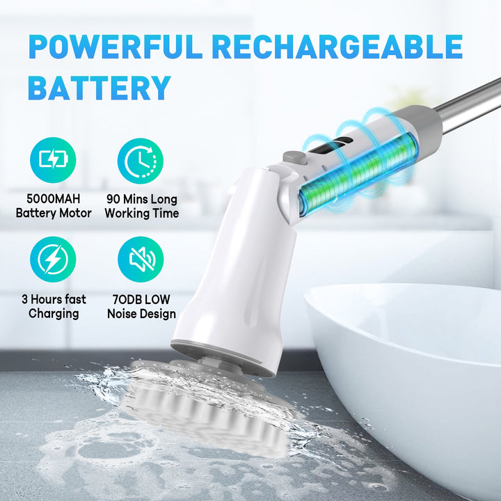 - 【POWERFUL &CONVENIENT】: Say goodbye to traditional cleaning tools, let the new household cleaning tools change your life. We collected the needs of users from all over the Internet, combined with the advice of top designers, to produce an ergonomic electric spin scrubber. The electric spin scrubber uses top-of-the-line chip technology. Battery capacity up to 5000MAH. The battery takes 3 hours to fully charge and will work for up to 90 minutes on a full charge.