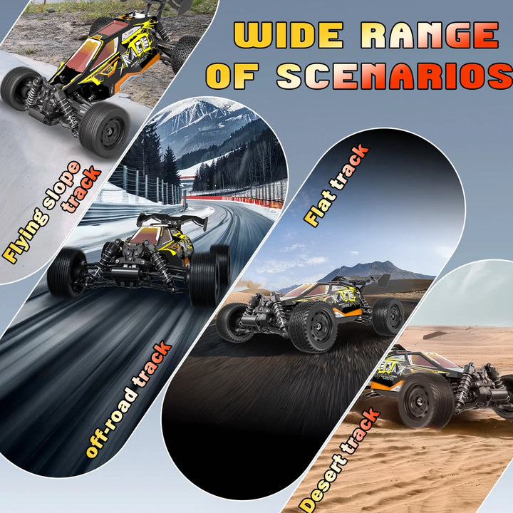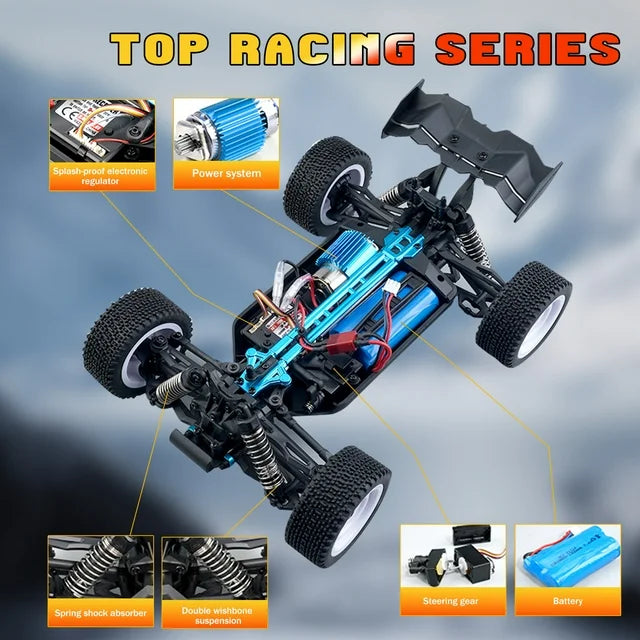 - Pro-Level Control System: Enjoy precision control with a 2.4GHz full-proportional remote system, responsive 17G five-wire servo, and splashproof 30A ESC/receiver combo. This rc buggy drives like a real car — throttle, brake, reverse, and steer with professional-grade handling.