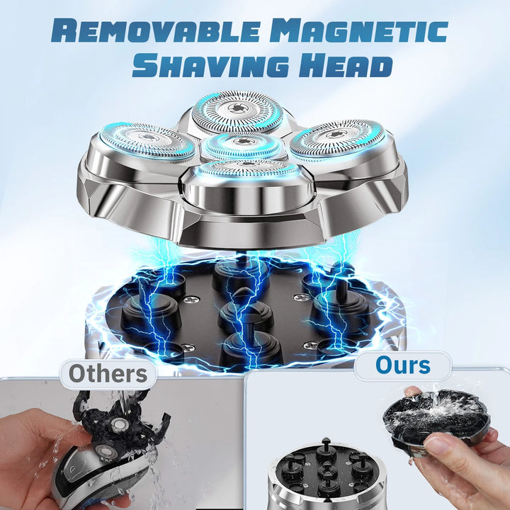 Experience the ultimate in grooming convenience with LOHEER head shavers for bald men, featuring five flexible floating heads that adapt seamlessly to your contours for a smooth shave. LOHEER magnetic electric razor features a newly upgraded magnetic design that allows for easy removal and installation in less than a second. electric razor for men A full charge provides up to 150 minutes of usage time.The shaver's body is designed with a polygonal shape, providing a comfortable and non-slip grip for both dry and wet shaving. It is lightweight and compact, making it convenient for travel and trips. Enjoy unparalleled comfort and ease with this versatile and powerful grooming tool.