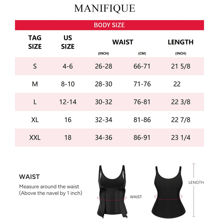 Elevate your workout routine with the MANIFIQUE Waist Trainer for Women. Crafted with a double-layer, lightweight, and stretchy fabric, this corset-style top provides tummy control and sculpts an hourglass shape. Featuring adjustable hooks and a zipper closure, it offers customizable compression for a comfortable and supportive fit. The spiral steel boning helps prevent rolling and provides lumbar support, while the long torso design hides bulges and bumps for a sleek, streamlined look. Whether you're hitting the gym or running errands, this versatile waist trainer can be worn under or over your everyday clothes.