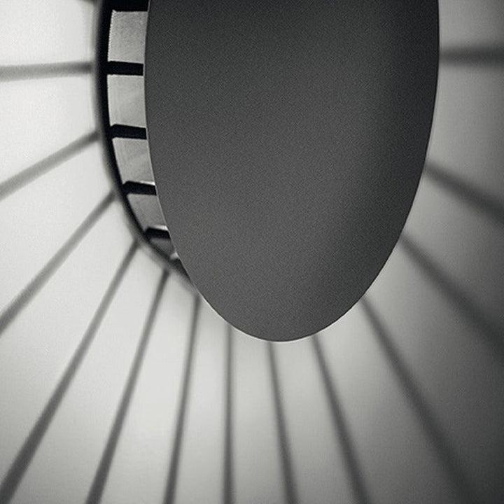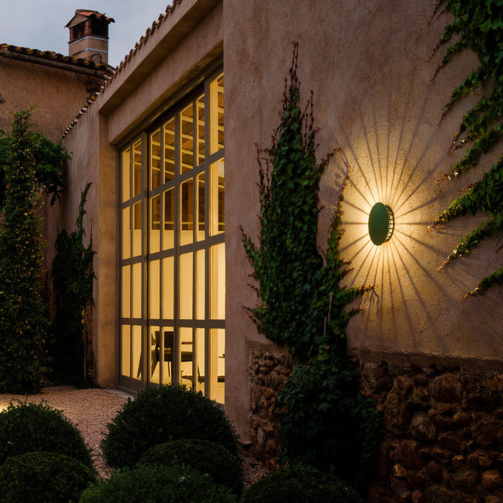The Meridiano lamp collection, designed by Jordi Vilardell, projects a comfortable light that creates patterns of light and shadow, making a magical luminous effect. The Meridiano light is equipped with a LED light source, which provides an indirect light from beneath its cover. The structure of steel rods is organized in a circular arrangement that create shadows onto the adjacent wall. The Meridiano light is manufactured in two colors which clients can choose from: mattee lacquered khaki and mattee lacquered off-white. Meridiano is an outdoor wall light installed on a surface. Available in two colors: khaki, and off-white.