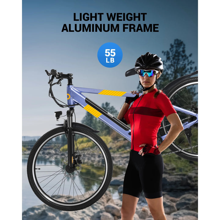 MIHOVER 26" electric mountain bike adopts a light aluminum alloy frame, a stronger 550W high-speed brushless motor and a 48V 7.8Ah Hidden Removable Lithium Battery (UL 2849 certified), and high strength Lockable Suspension Fork, making riding more comfortable and stable, mechanical front and rear disc brake design, Shimano 21 speed and 3 levels pedal assistance(throttle). E-bike speed can reach 20mph, allowing you to commute and ride in the mountains more freely!