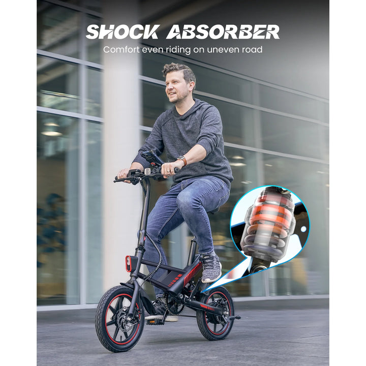 MIHOVER Update 450W lightweight EBike with max speed 18.6mph, up to 28 mileage long range, assisted range 45 miles, 14" air-filled tires, dual disc braking, 36V/10A battery, 3 riding modes, max load 265 lbs for commuters!MIHOVER 14'' Electric bikes can be smooth and cost-effective to get around and help you take the weight off tired legs or tackle tricky uphill stretches with ease!