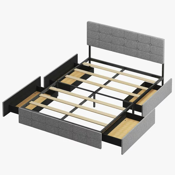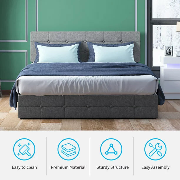 🎄The bed frame and headboard are covered with high-quality linen for comfort and breathability. It will not feel stuffy even in summer, giving you and your family a more comfortable sleep. And this bed frame with storage has 4 large storage spaces for off-season clothes, quilts, children's toys and various items to make the most of the space.
