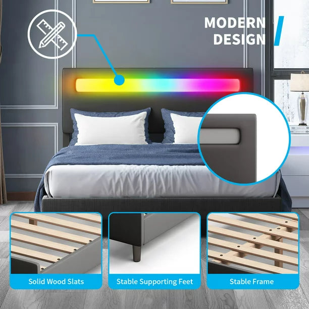 🎄【 No Box Spring Required 】 LED Platform Bed Frame has thickened hardwood slats, which are firm and stable, suitable for all kinds of upholstery, such as memory foam, latex or spring mattress, the mattress can be placed directly on the bed slats.
