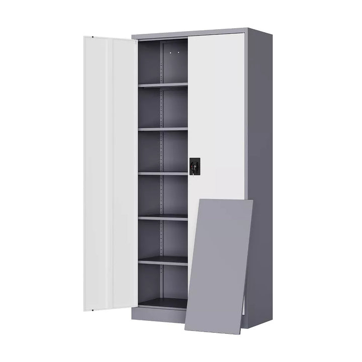 Use the modern-style metal storage cabinet to provide ample storage space for your home, office, garage, basement, school, workshop, or warehouse space. Made of cold rolled steel and full-length welded reinforcements to ensure years of durability. 4 adjustable dividers for you to adjust at your leisure. Comes with 2 keys for co-ownership or as a backup in case of loss.