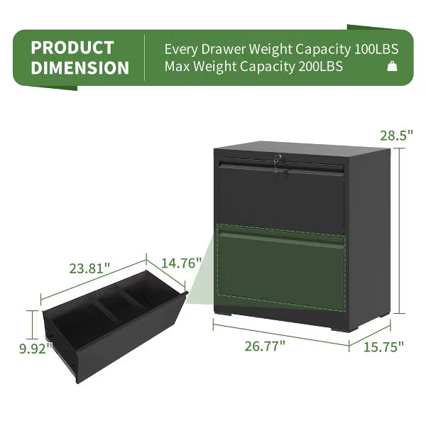 This Munora 2-drawer lateral file cabinet combines security and spacious storage for home office use. The black steel unit (15.75"D x 26.77"W x 28.5"H) features a central locking system with two keys, securing both drawers while an interlock mechanism prevents tipping in compliance with ASTM F2057 safety standards. Adjustable hanging rails accommodate letter, legal, A4, and F4 folders in dual-column configurations, with each drawer supporting 100 lbs (200 lbs total). The powder-coated finish resists wear, and full-extension ball-bearing slides ensure quiet, smooth access to all files. Shipped with assembly tools and a 2-year warranty, this cabinet’s wide span optimizes organization for large document collections.