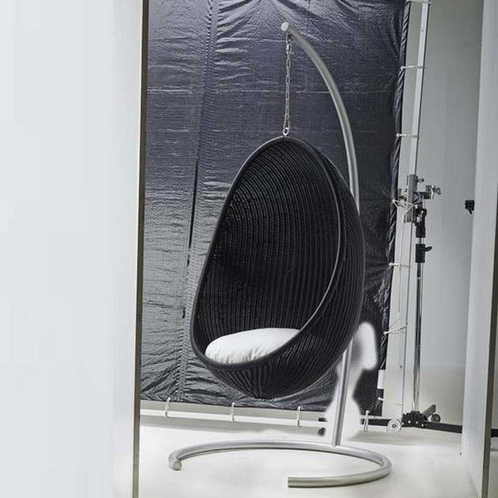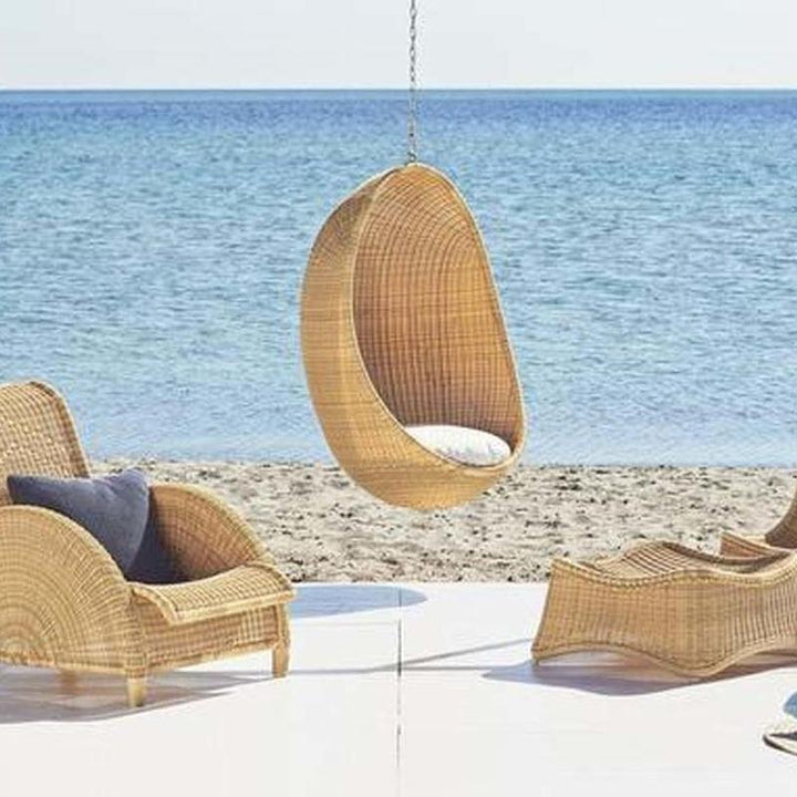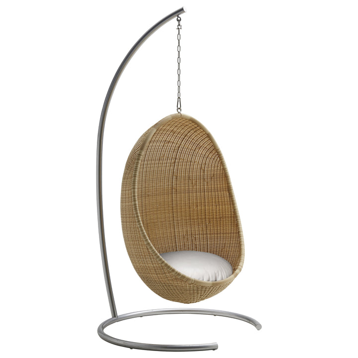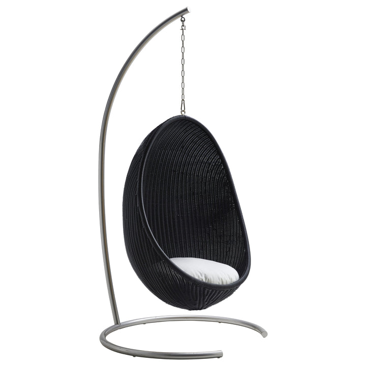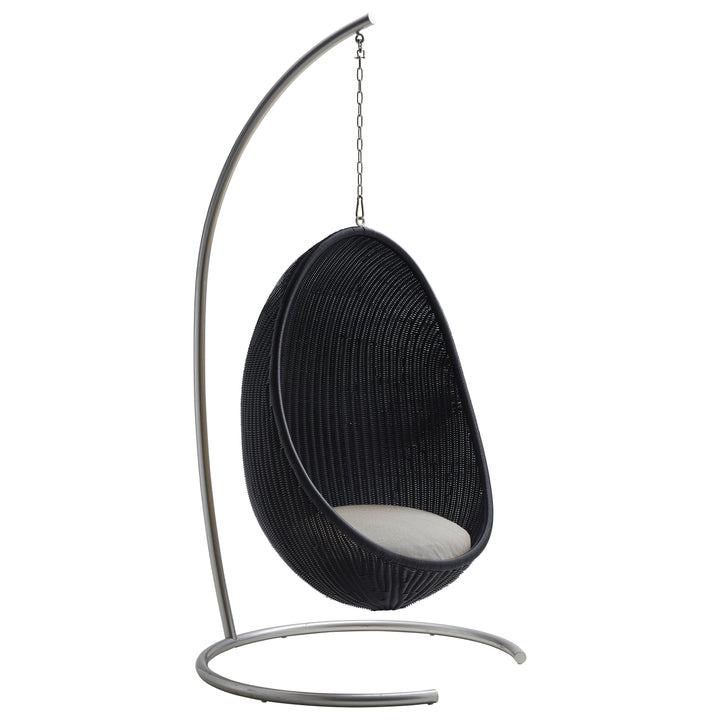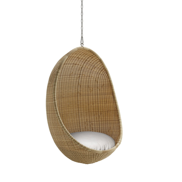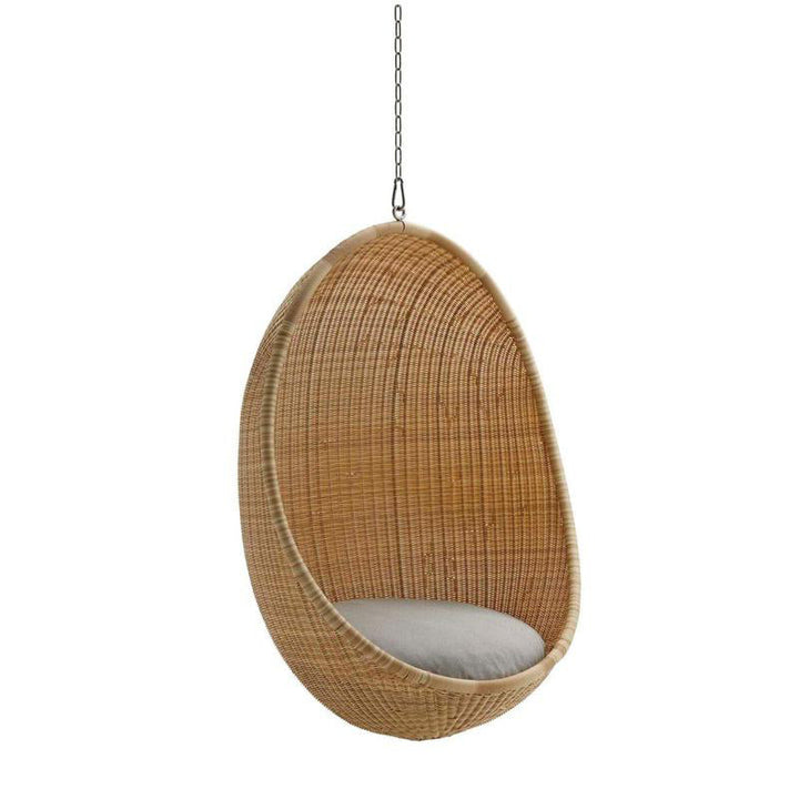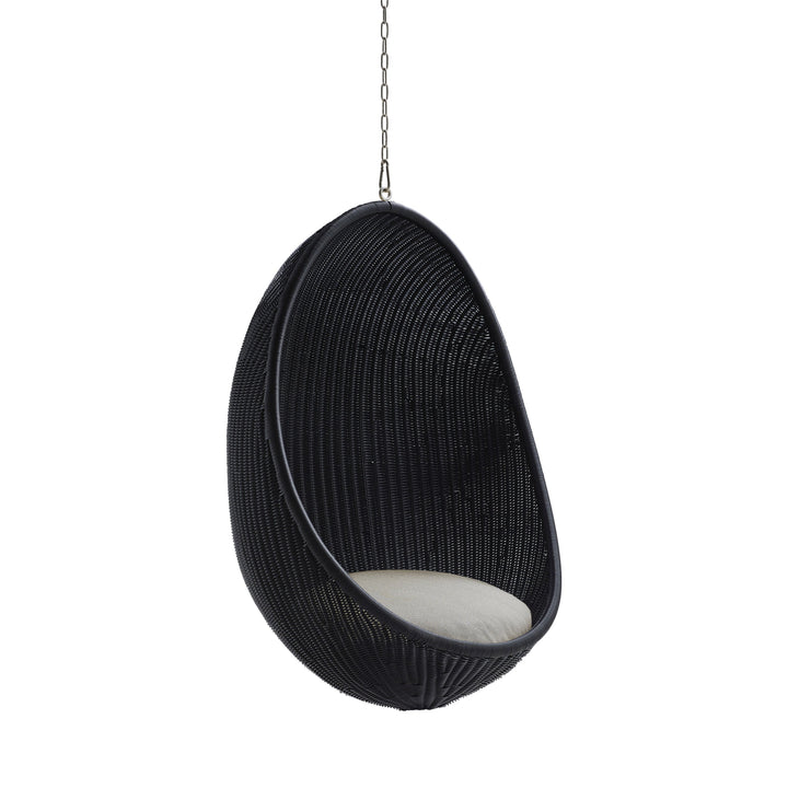 A timeless classic, ideal for any patio or garden the Nanna Ditzel Outdoor Hanging Egg Chair from Sika Design brings breezy-chic style to your favorite al fresco areas. First presented in 1959, the woven rattan shell of this iconic design still serves as an incomparable choice for seating and style. Available in both natural rattan and black, with complementing color options for the cushions, this chair arrives fully assembled and ready to be installed. Perfect as a relaxing spot on a beck deck or roof top patio, for an unexpected design, select two or more of these chairs to act as chairs around an outdoor dining table for high-end coastal appeal. An elegant piece with the utmost charm, this chair turns heads wherever it hangs.