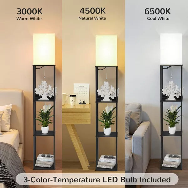 This 62-inch tall floor lamp combines practicality and style. It features three storage shelves for books or decorative items. The 9W, 800LM bulb offers three color temperatures (3000K/4500K/6500K). In addition, this floor lamp is equipped with two USB ports and an outlet for conveniently charging electronic devices. It comes with assembly tools and is easy to put together. The fabric lampshade brings a simple elegance that can seamlessly blend into any setting, making this floor lamp suitable for placement in living rooms, studies, bedrooms, and offices.