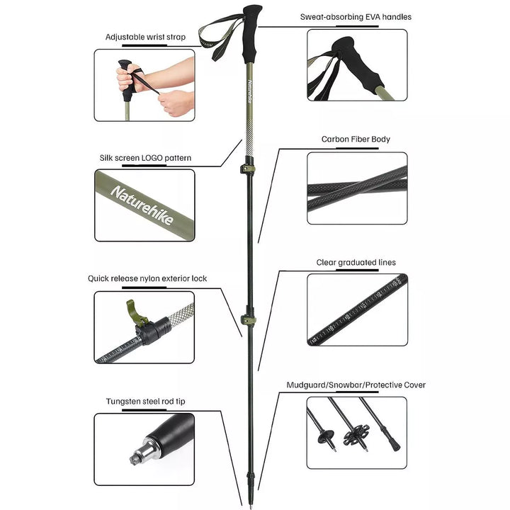 Naturehike trekking poles are crafted from 3K carbon fiber, ensuring high durability and ultra-lightweight performance for outdoor adventures. Designed with a telescopic three-section adjustable system, these hiking poles extend from 62cm to 135cm, making them suitable for various terrains and users of different heights. The EVA foam grip provides a comfortable, sweat-absorbent, and non-slip hold, enhancing stability and reducing strain on hands. Each set includes essential accessories such as mud baskets, snow baskets, and rubber tips, making them ideal for hiking, trekking, mountaineering, and backpacking. Lightweight and compact, these trekking poles offer superior performance and convenience for all outdoor enthusiasts.