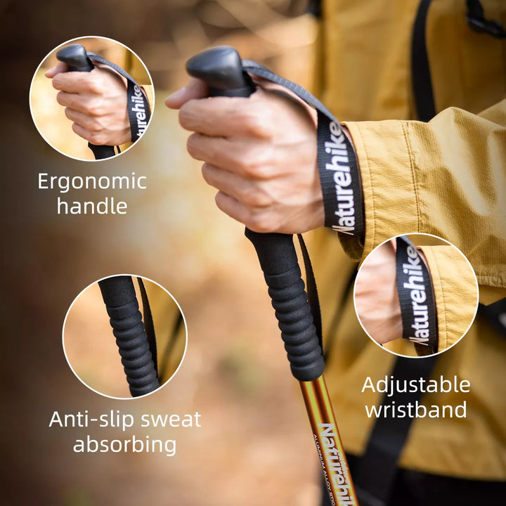 Meet Naturehike's Upgraded Trekking Poles: precision-engineered for all adventurers. Crafted with aircraft-grade 6061 aluminum alloy, these ultralight poles feature a quick-release buckle lock for effortless height adjustment and an ergonomic EVA foam grip with anti-slip spiral texture. Choose your fit: Black/Sky Blue: 61-135cm (24-53in), 235g/pole (0.52lb) Golden: 56-120cm (22-47in), 220g/pole (0.49lb) Red (Compact): 50-100cm (20-39in), 190g/pole (0.42lb) Includes detachable mud basket, iron tip cover, and adjustable wrist strap. Ideal for hiking, snow, or muddy trails!