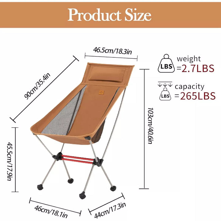 ULTRALIGHT & COMPACT PORTABILITY -- Weighing just 3 lbs, this camping chair can be easily carried with a single hand. When not in use, it packs down into an impressively compact 22" x 5.9" size, allowing you to stow it in your backpack, car, or RV with ease. Embrace a lighter, more mobile outdoor experience.