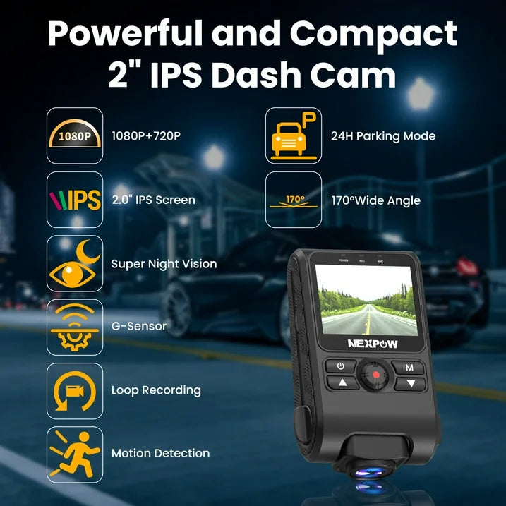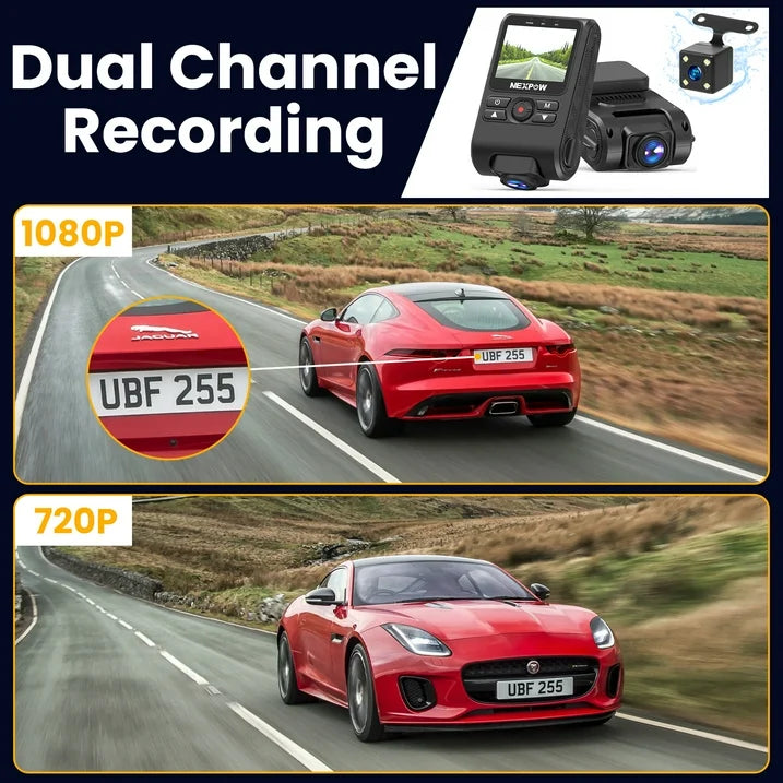 1080P FHD & 170°+150°WIDE ANGLE DUAL RECORDING - NEXPOW brings you the dash cam front and rear, which can record Full HD 1080P front video + 720P rear video. The DC02 dash cam helps you read key details such as road signs and vehicle license plates more clearly, bringing you better driving pleasure and better security. This car camera is equipped with a 170° wide-angle front camera and a 150° wide-angle waterproof rear camera, it nearly capture the entirety of the road.