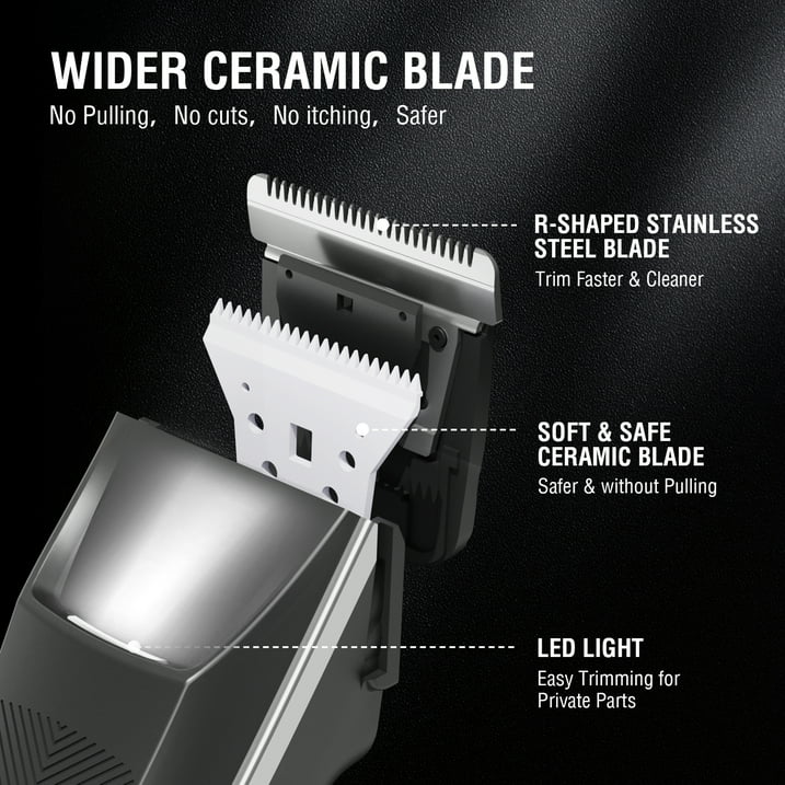 - POWERFUL DETACHABLE HEAD TRIMMER: NEXPURE comfortable groin hair trimmer motor runs at a high speed of 6500 rpm/min, equipped with 2 replaceable high-grade ceramic blades for fast trimming without scratching, pulling skin.