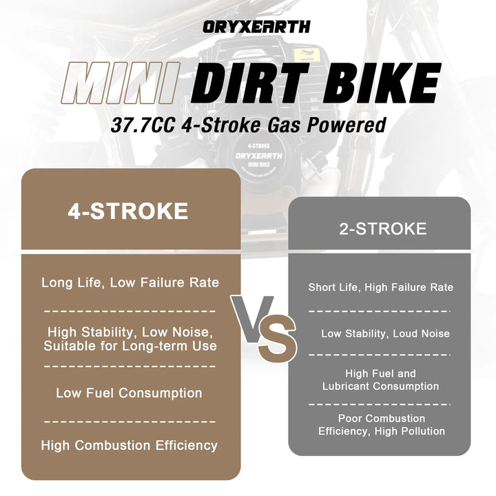 - 【Powerful Performance】: The Oryxearth kids mini dirt bike features a powerful and efficient 1.36HP 37.7CC 4-stroke air-cooled engine, which provides higher stability, a longer service life, and a lower failure rate. It is also fuel-efficient (requires gasoline with an octane level of 87 or higher, preferably non-ethanol gasoline).