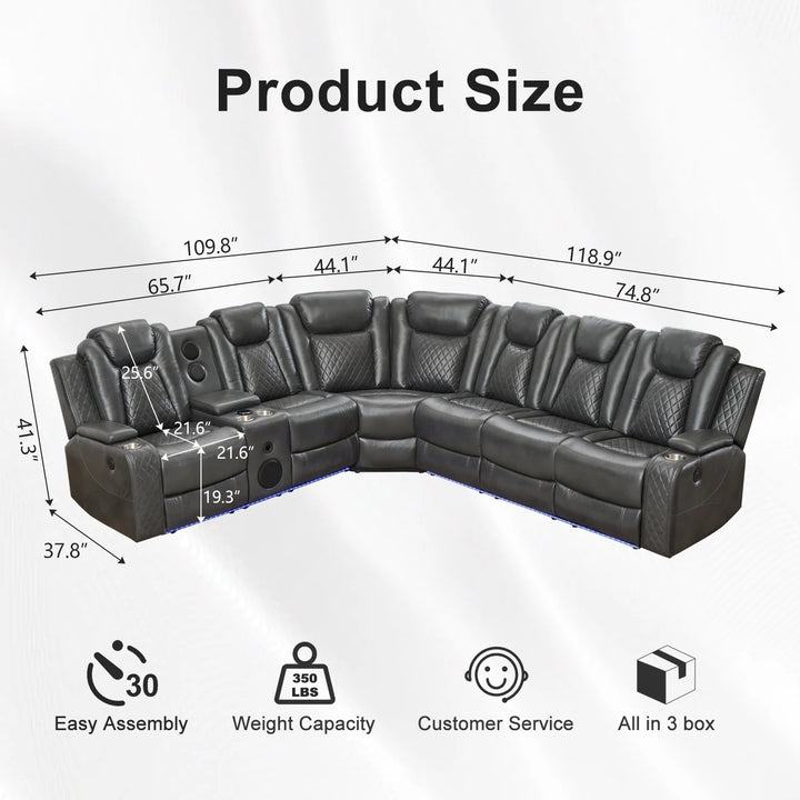 Experience the ultimate in relaxation and functionality with this power recliner sectional sofa, designed with convenience and comfort in mind. Featuring built-in USB and Type-C ports along with wireless charging capabilities, you can keep devices powered up with ease. Built-in bass speakers create an immersive sound experience, complemented by LED lights that enhance your living space with a cozy ambiance. With ample storage, including a storage console and cup holders, you can keep essentials close at hand. Enjoy customizable reclining options, perfect for reading, lounging, or entertaining.