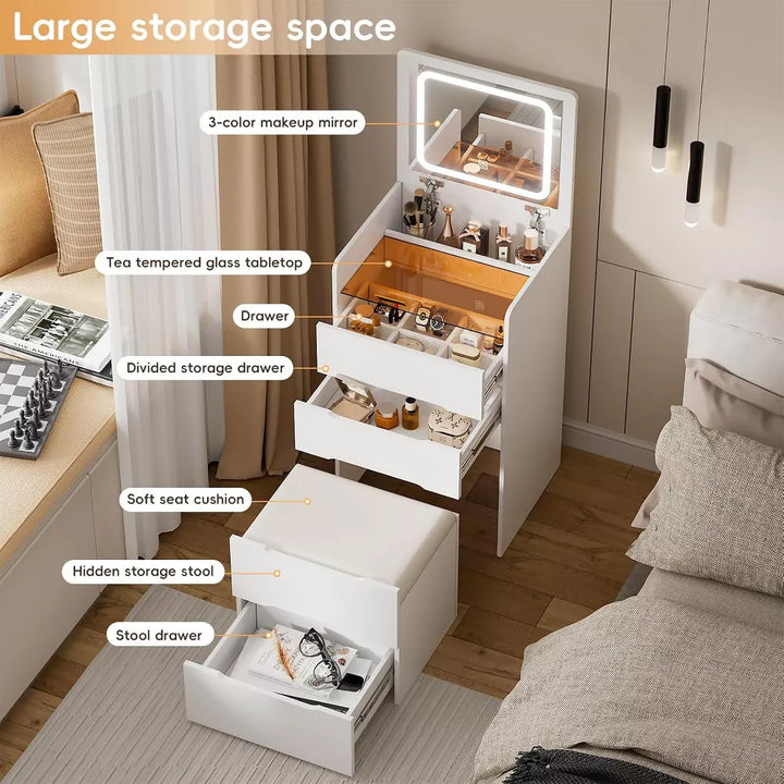 Practical and Functional: The vanity, nightstand and chair are all in one. It's a compact corner vanity-nightstand. The vanity table also comes with a flip-up mirror. It flips open to be a simple vanity and closes to be a nightstand with great storage space. This is a more space-saving design.