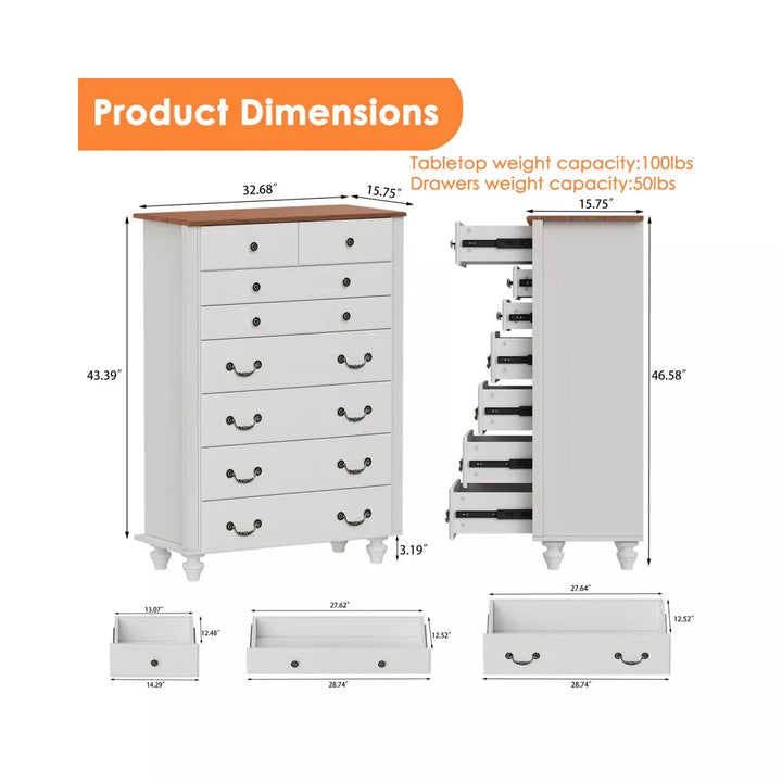 PAKASEPT 43" Farmhouse 8 Drawers Dresser for Bedroom, Tall Wood Chest of Drawers with Vintage Handle for Bedroom, Living Room