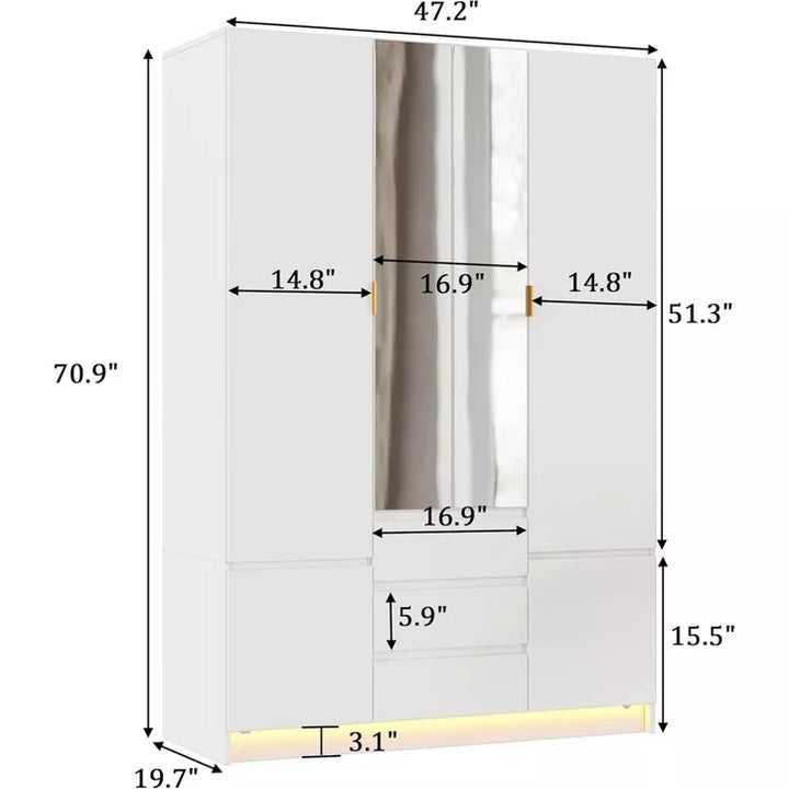 PAKASEPT 47" W Armoire Wardrobe Closet with 4 Door & 2 Mirror, with LED Light & 3 Drawers, Storage Cabinet with Hanging Rod for Bedroom
