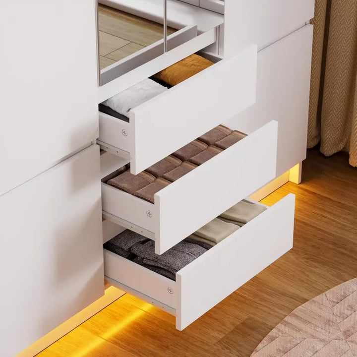 【Multi-Light RGB Wardrobe】 Bedroom armoire with drawers has built-in warm LED lights, just plug in and connect to power, giving your bedroom a warm atmosphere,creating different home styles and romantic ambiance.The three cabinets with aluminum alloy hanging rod for storing your suits, shirts and skirts, downside area of the cabinet can store stack clothes, two side bottom storage cabinet for storing bedding or household items. 3 drawers at the bottom can store your personal belongings.