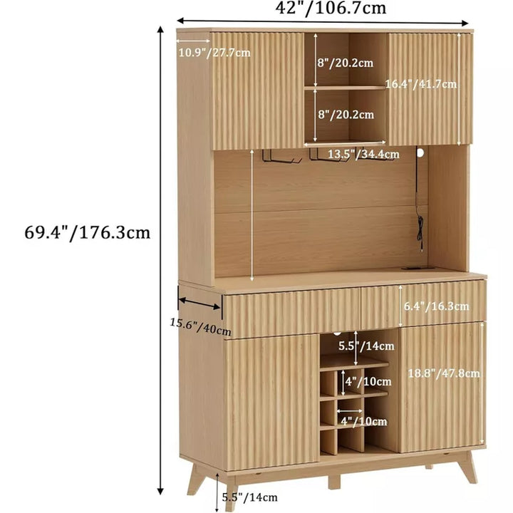 PAKASEPT 70" Fluted Coffee Bar Cabinet with Power Outlet & Light, Kitchen Hutch with Drawers, Shelf and Wine Glass Rack, Pantry China Cabinet for Home