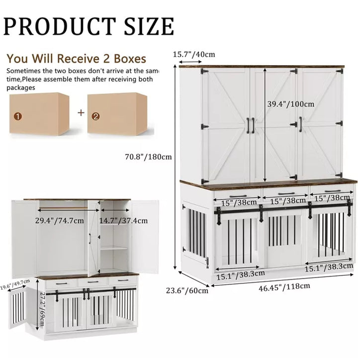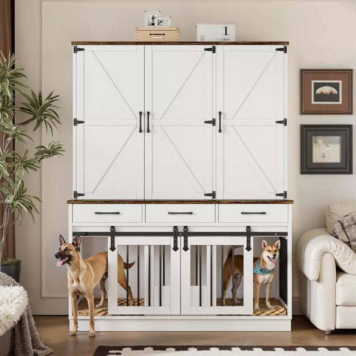 PAKASEPT 71" Tall Dog Crate Furniture, Indoor Dog Kennel with Wardrobe Closet, 46.5" W Dog Cage for Large/Medium Dogs, Wood Dog Crates with 3 Drawers