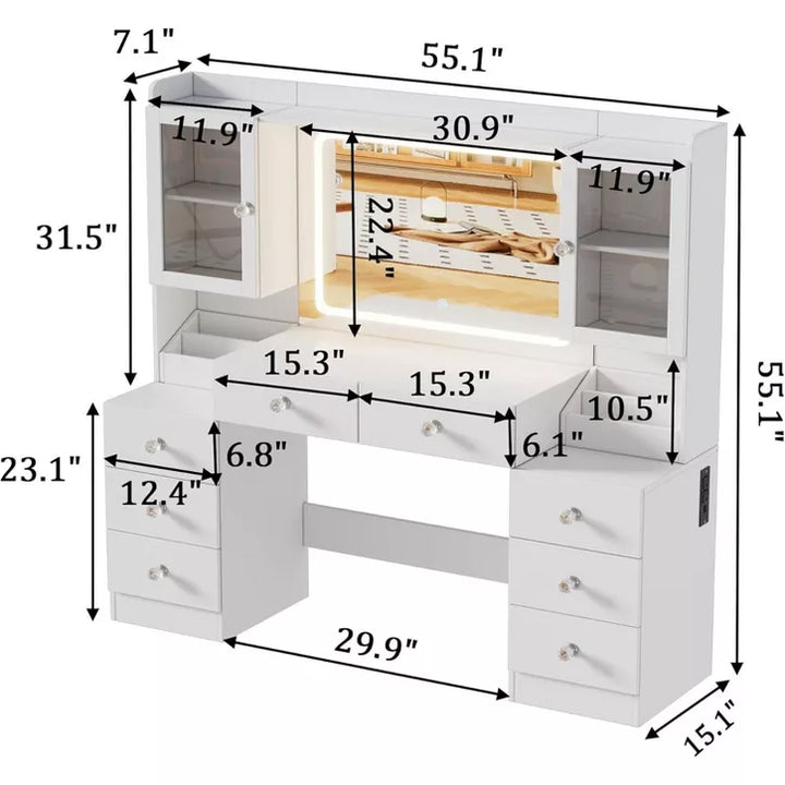 Vanity Desk Size: 55.1”L×15.1”W×55.1”H Vnity Mirror Size: 30.9''L * 22.4''W Color:White Vanity Table Weight: 130lbs Material: MDF Board What's Included: 1 x Makeup Vanity Desk 1 x Mirror 1 x Charging Station 1 x Assemble Instruction 1 x Assembly Tools