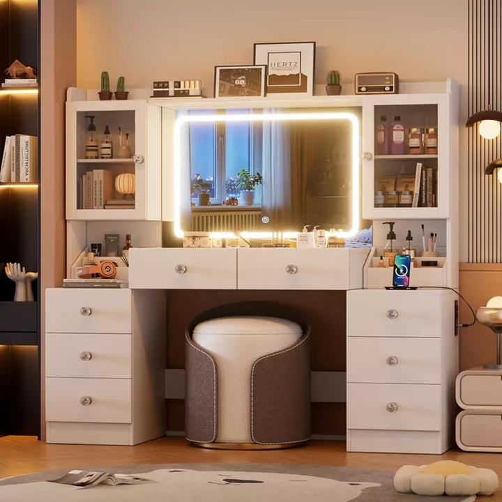 【Powerful Storage Space & Glass Door Cabinet】This large makeup vanity will let you say goodbye to cluttered storage. 8 drawers, spacious tabletop, side open shelves and 2-tier hidden storage shelves with glass door hold all your cosmetics and other beauty essentials, In addition, the drawer cabinet is designed at a height that can be used as a nightstand. The two drawers on both sides have additional storage shelves above, which is convenient for you to store some daily items.