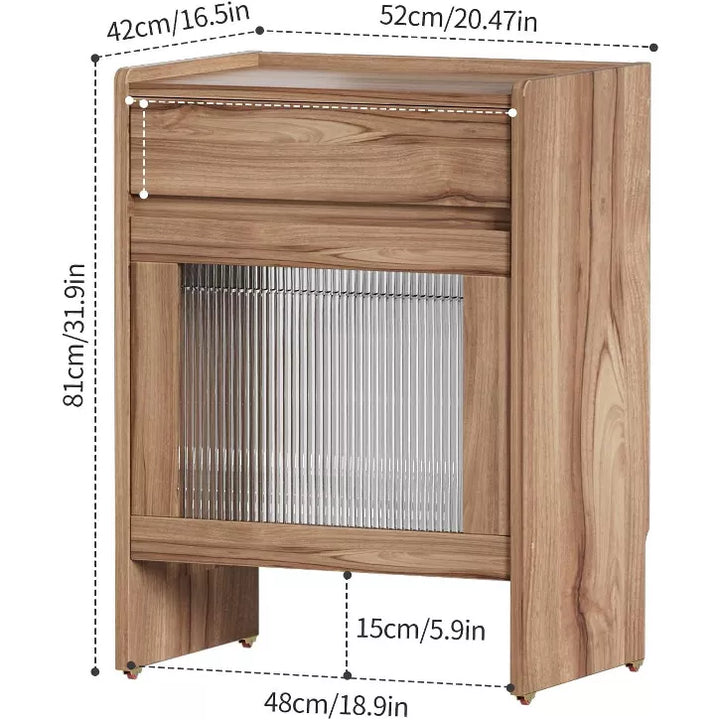 【Sturdy and Built to Last】Crafted from premium wood, this wood storage cabinet with wheels offers a strong, practical structure. The thickened tempered glass door with a wave pattern adds a touch of modern grace.