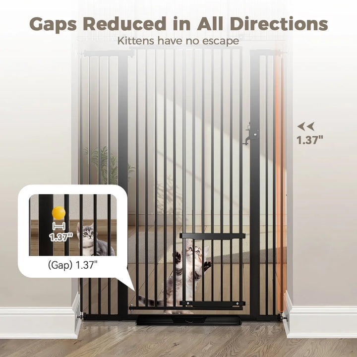 - 💖【ULTRA-DENSE PIPE SPACING】The space between the tubes is 1.37", ultra-narrow so that pets or kids cannot squeeze through or get their heads stuck between them, making it an ideal baby gate and baby safety gate. The included 2 extensions allow for a customizable width between 29.13" and 42.08". Please measure your openings before purchasing this extra tall baby gate and dog gate.