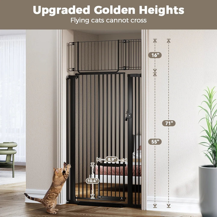 - 💖【71" EXTRA TALL BABY SAFETY GATE AND DOG GATE】Gate stands 71 inches tall for added security, which is much taller than most extra tall baby safety gates and cat gates available on the market, thus effectively preventing pet cats from jumping out and keeping your little ones safe. Suitable for families with kids and pets of different sizes, especially those with strong jumping or climbing abilities.