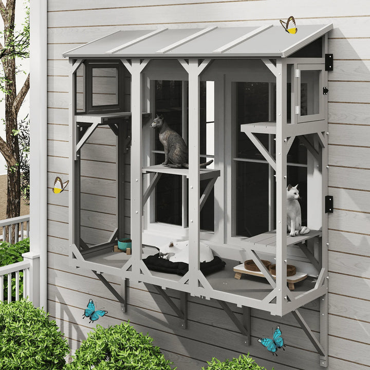 Large Window Catio for Cats This spacious 66" x 21" x 62" catio provides a panoramic view for your indoor cat to safely enjoy the outdoors. It includes sturdy jump platforms. With 3 doors for easy cleaning and interaction, it fits most windows (up to 59.5" wide) and is ideal for both wooden and brick walls, offering a comfortable lounge area for your cats to stretch, play, and relax.