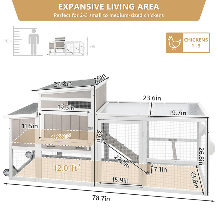 - 【SIZE & ASSEMBLY】Overall dimensions: 78.7"L x 26"W x 39"H, offering a total of 16.83ft²(4.82ft² on the 2nd level and 12.01ft²on the 1st level). Suitable for small poultry such as chickens and ducks, some coops can also accommodate rabbits, function as shelters for small mammals like guinea pigs, or serve as a general small animal enclosure. The included manual clearly labels each screw and accessory for quick and easy assembly. If you encounter any issues during purchase or use, please contact us, and we'll promptly assist you.