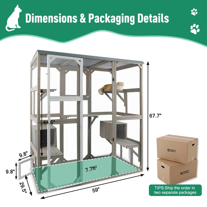 - Easy to Assemble and Clean: The outside large cat patio dimensions is 29.5" L x 59" W x 67.7" H,with 63.8"H openable doors,you can walk into the large catio cage to clean.Set it up easily according to the manual and parts in numbers,and pre-drill screws.Please feel free to contact us if you any question about the cat house.