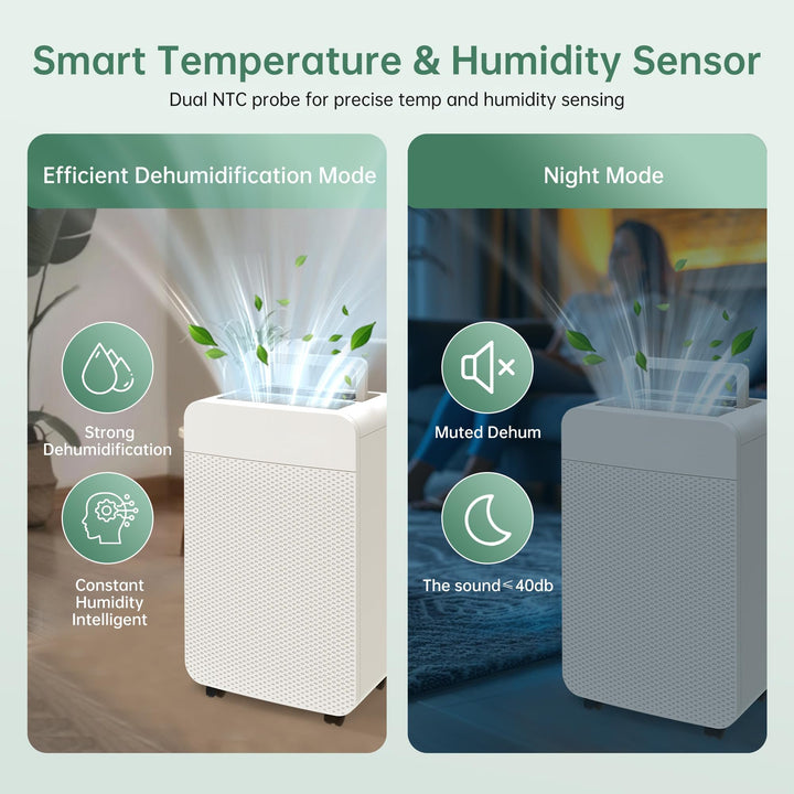 【Powerful Compressor】This Bedroom Dehumidifier Is Equipped With A Powerful Air Compressor That Can Suck Moist Air Into A Coil Filled With Coolant. Equipped With Automatic Defrosting Function, This Means That When Frost Forms On The Evaporator Coil, The Compressor Will Cycle Off While The Fan Continues To Run Until The Frost Disappears. Condensed Moist Air Drips Into The Reservoir From The Coil, Discharging Dry And Fresh Air Into The Room.